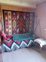 Уютный дом в тихой деревне. Дом рубленый с пристроенной террасой и гаражом. В доме прихожая, летняя кухня, две спальные комнаты на первом этаже, санузел, мастерская, на втором этаже две спальные комнаты. Отопление небольшой печкой, электрические конвектора, инфракрасный обогреватель, магистральный газ по границе участка. Вода из собственного колодца. Участок огорожен, стоянка для автомобиля с распашными воротами. Рубленая двухэтажная баня, хозяйственный блок. Остановка автобуса, монастырь в шаговой доступности.