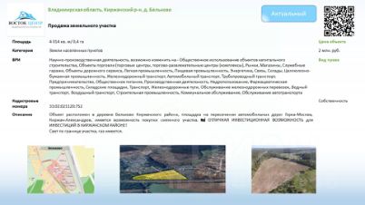 Уникальный участок 35 соток (д. Бельково, Горка) для бизнеса! ПЗЗ П-2: Склад, Производство, Магазин, НИОКР, Дорсервис. Готовый съезд на трассу + ЖД примыкание! Документы готовы. Инвесторам!Продается земельный участок 35 соток в п. Горка (Киржачский р-н, Владимирская обл.), д. Бельково. Идеален для научно-производственной деятельности и не только!Ключевые преимущества и характеристики: Выгодное расположение:Примыкание к автодороге Киржач-Александров! Съезд уже оборудован, разрешение оформлено, ТУ и проект на руках.Железнодорожные пути (МЖД, ж/д тупик ст. Бельково) примыкают к границам участка уникальная логистическая возможность!~10 км от г. Киржач (на север).~99 км от МКАД (Щелковское шоссе), ~100+ км по Ярославскому/Горьковскому.~63 км от ЦКАД, ~53 км от Горьковского шоссе (Москва-Казань), ~44 км от Ярославского шоссе. Территориальная зона П-2:Разрешенные виды использования (можно выбрать БЕЗ дополнительных согласований!):Научно-производственная деятельность (основное)СкладыОбъекты дорожного сервиса (АЗС, кафе, мотели и т.д.)Магазины (розничная торговля)Легкая промышленностьПищевая промышленность...и другие виды согласно ПЗЗ.Допускается строительство складов и производств IV-V классов опасности. Инфраструктура на участке/у границ:Свет: Электричество подведено к участку 15 кВт.Газ: Газопровод высокого давления (АО ''Газпром газораспределение Владимир'') рядом. Возможен запрос мощностей под проект. Готовность к сделке:Все документы в порядке и готовы к продаже.Кадастровый номер: 33:02:021120:692Гибкие условия: Рассматриваем раздел участка на меньшие доли и варианты долгосрочной аренды.Это готовое решение для вашего бизнеса с отличной транспортной доступностью (авто + ЖД) и минимальными административными барьерами для старта! Идеально для: Инвесторов, производственных компаний, логистических операторов, сетей дорожного сервиса, научно-технических предприятий, оптовых баз.Звоните, чтобы узнать детали и договориться о просмотре!Теги (Хэштеги):#ПродажаЗемлиВладимир #ЗемляКиржач #УчастокПромназначения #СкладВладимир #ПроизводствоВладимир #ИнвестицииВЗемлю #ЗонаП1 #ЖДУчасток #УчастокУТрассы #Бельково #Горка #КиржачскийРайон #НаучноПроизводственнаяДеятельность #Склад #ПищевоеПроизводство #ЛегкаяПромышленность #ДорожныйСервис #Магазин #ЗемляБизнес #КоммерческаяНедвижимость #ИнвестицииВНедвижимость #ЦКАД #МЖД #Газ #Свет #ДокументыГотовы #РазделУчастка #АрендаЗемли