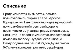Код объекта: 1710012.Уникальное предложение для инвесторов и предпринимателей: земельный участок в Суздальском районе, идеальное место для реализации ваших бизнес-идей!Продаётся земельный участок площадью 10,21 соток по адресу: Россия, Владимирская область, Суздальский район, муниципальное образование Павловское, село Барское-Городище, Центральная улица, 52. Участок имеет статус ''промназначения'', что открывает широкие возможности для коммерческого использования.Участок обеспечен удобным подъездом с асфальтированной дорогой, а также подключён ко всем необходимым коммуникациям: электричеству, водоснабжению, газу и канализации. Это значительно упрощает процесс начала строительства и минимизирует первоначальные затраты.Расположенный всего в 20 километрах от города, участок сочетает в себе преимущества спокойного загородного окружения и доступности городской инфраструктуры.Не упустите шанс приобрести этот участок — потенциал для развития вашего бизнеса здесь очевиден. Позвоните нам прямо сейчас, чтобы узнать больше и договориться о просмотре.Мы гарантируем безопасную сделку и юридическую поддержку нашим Клиентам.