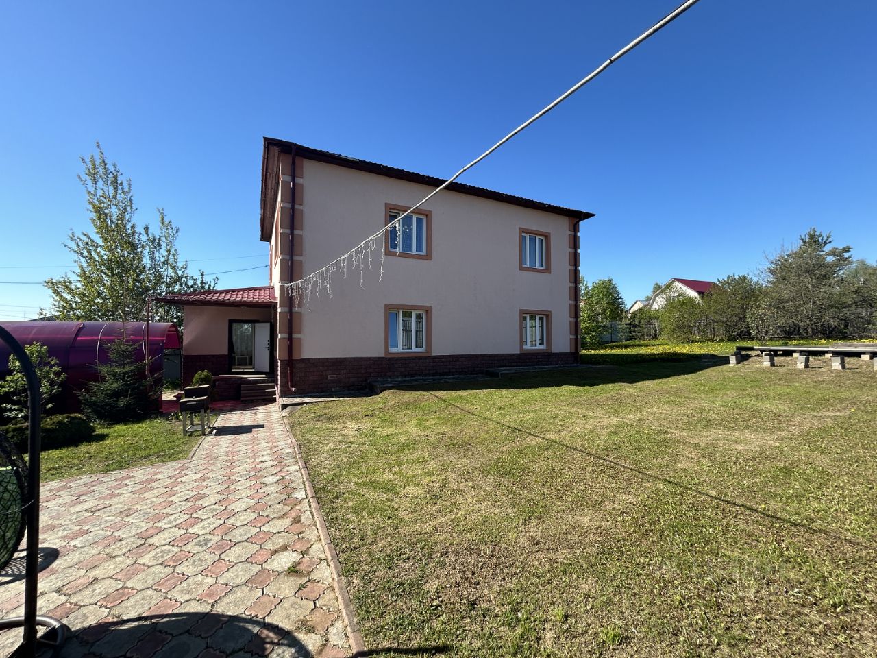 Двухэтажный дом из красного кирпича общей площадью 200 кв.м. расположен на монолитном фундаменте ( плита 10 х 12 х 2,8 м ). Стены толщиной 60 см. Межэтажные перекрытия в доме - железобетонная плита. Жилая площадь 100.6 кв.м. Все помещения в доме тёплые. Окна ПВХ. При выходе в дом сделана закрытая терраса с теплыми полами (электрические) и батареей от общей системы, подход к дому также выложен плиткой. На первом этаже расположена бойлерная, раздельный сан-узел ( ванная 5.5 кв.м. туалет 1.7 кв.м.), сауна 2.9 кв.м.