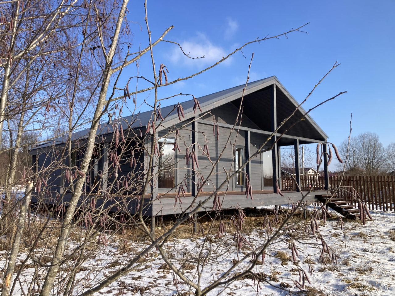 Планировка: терраса , прихожая, просторная кухня-гостиная с панорамными окнами и выходом на террасу, 2 спальни по 11м2, гардеробная, котельная, санузел. В санузле установлены точки подключения сантехники и электрики, стиральной машины.
