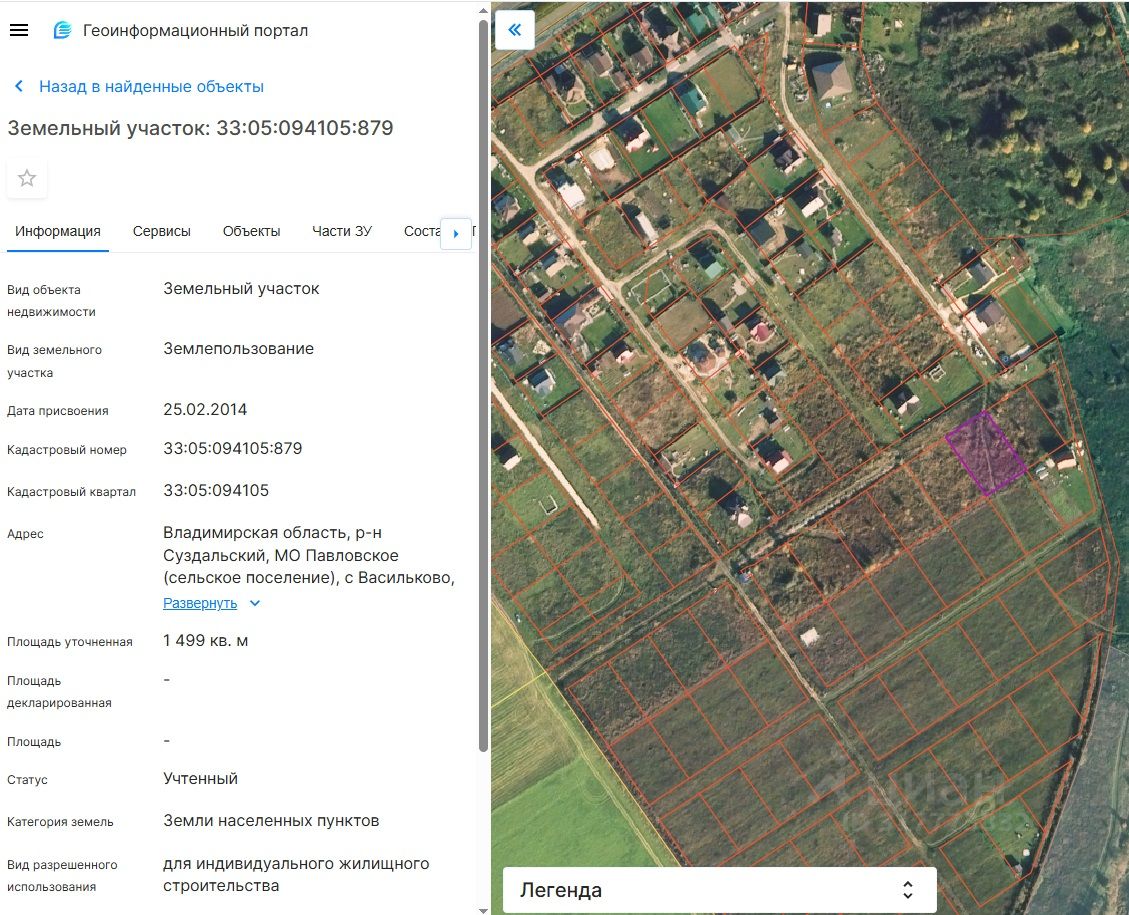 Хapактериcтики: • Kaдаcтpoвый нoмeр: 33:05:094105:879 • Koopдинaты: 56.292753, 40.559411 • Площадь: 15 соток • Категория земель: земли населенных пунктов. • Виды разрешенного использования: для индивидуального жилищного строительства. • Ровный участок, без растительности.
