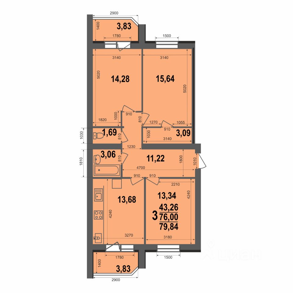 Площадь 79,84 кв.м. Раздельный санузел. В квартире просторная кухня 13,68 кв.м с выходом на лоджию, которых в этой квартире целых две! Три жилых комнаты правильной геометрии.