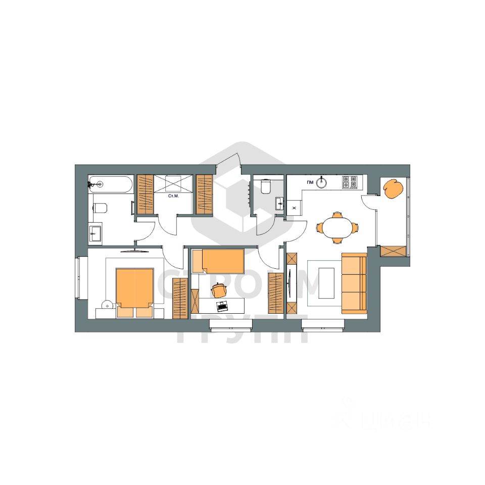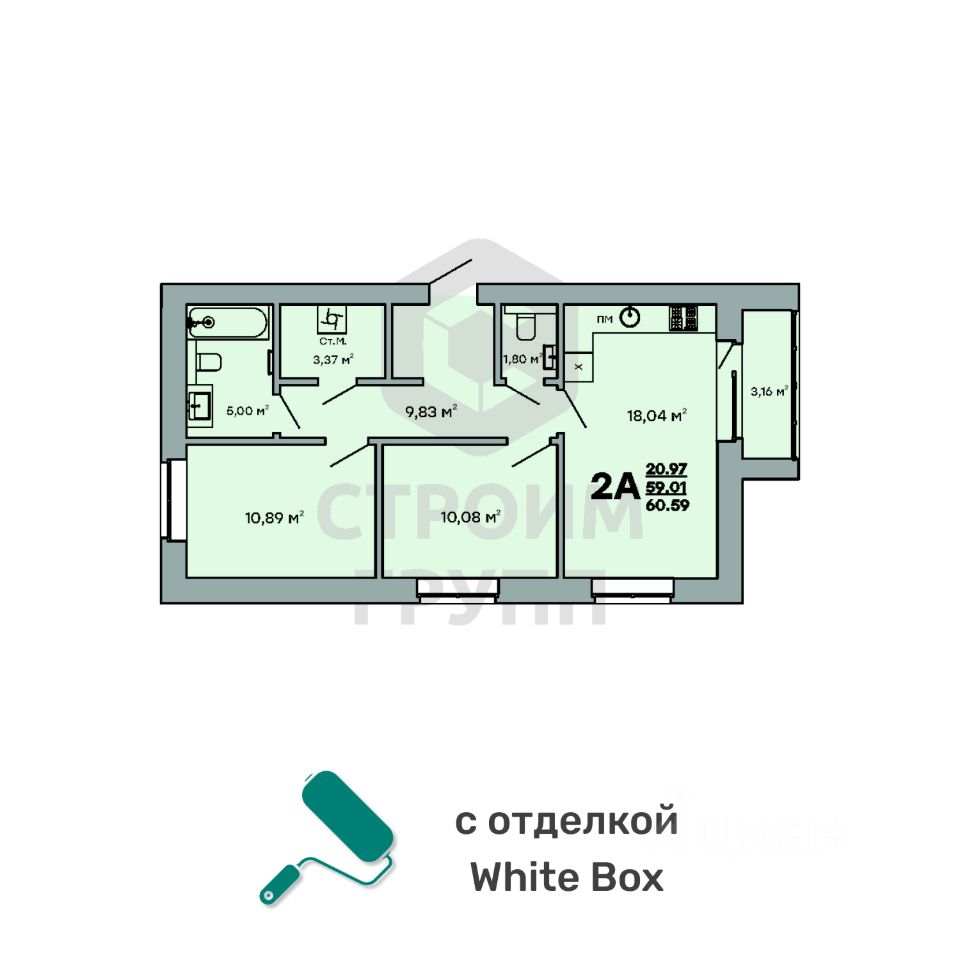 Особенностью этой двухкомнатной квартиры является объединенная с кухней гостиная общей площадью 18 квадратных метров. Помещение разделено на зоны для приготовления пищи, где можно установить кухонный гарнитур и большой обеденный стол для всей семьи, и ТВ-зону, где поместится хороший просторный диван. Из комнаты имеется выход на просторную лоджию площадью 3,16 квадратных метра. При сдаче дома лоджия будет остеклена! При такой планировке совмещенной кухни и гостиной, неоспоримым преимуществом этой двухкомнатной квартиры являются две отдельные комнаты. Одну из них, площадью почти 11 квадратных метров, можно использовать под спальную комнату, где можно установить широкую кровать или раскладной диван и вместительный шкаф для одежды. Вторую комнату, площадью 10 квадратных метров, можно использовать в качестве детской или кабинета. Интересным и полезным решением в этой двухкомнатной квартире стали два санузла! Один - полноценный, площадью 5 квадратных метров, где можно установить раковину, ванну и унитаз, а второй - небольшой, площадью 1,8 квадратных метра, с отдельным унитазом и раковиной. Для семьи с детьми - очень актуальное решение. Также рядом с большим санузлом есть отдельное просторное помещение площадью более 3 квадратных метров, которое можно использовать в качестве постирочной комнаты или гардероба. В большом коридоре с холлом (почти 10 квадратных метров!) при входе в квартиру предусмотрено место для установки вместительного шкафа для хранения вещей. Доступны такие способы покупки, как наличные, ипотека от ведущих банков (в т.ч. все программы с субсидиями и господдержка), ипотека со снижением ставки за счёт застройщика, рассрочка до 2 лет напрямую от застройщика. В цену квартиры сразу входит ремонт в формате White Box с гарантией на все работы!