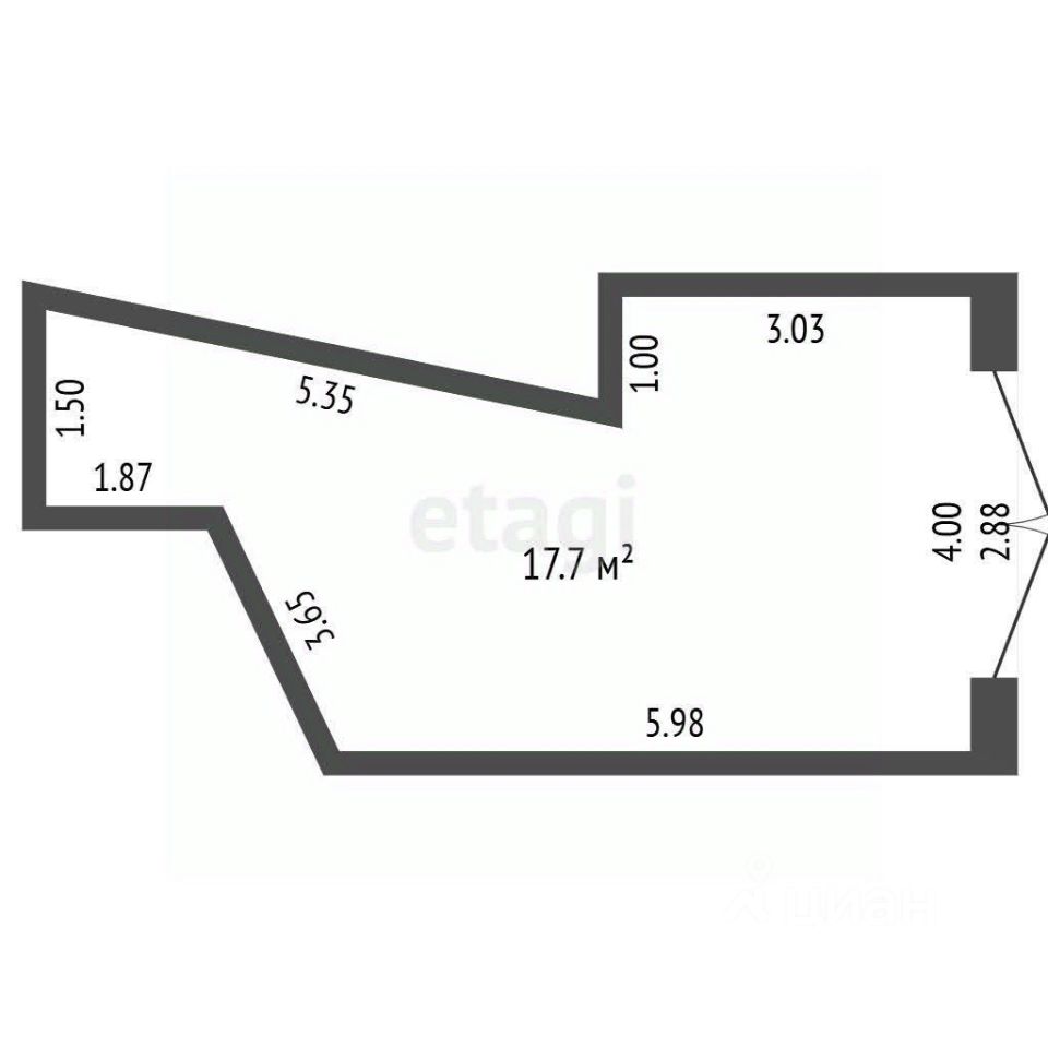 Общая площадь 17,7 кв. м.: высота 2.5 м., ширина 4 м., длина 5.9, на участке 22,3 кв. м.