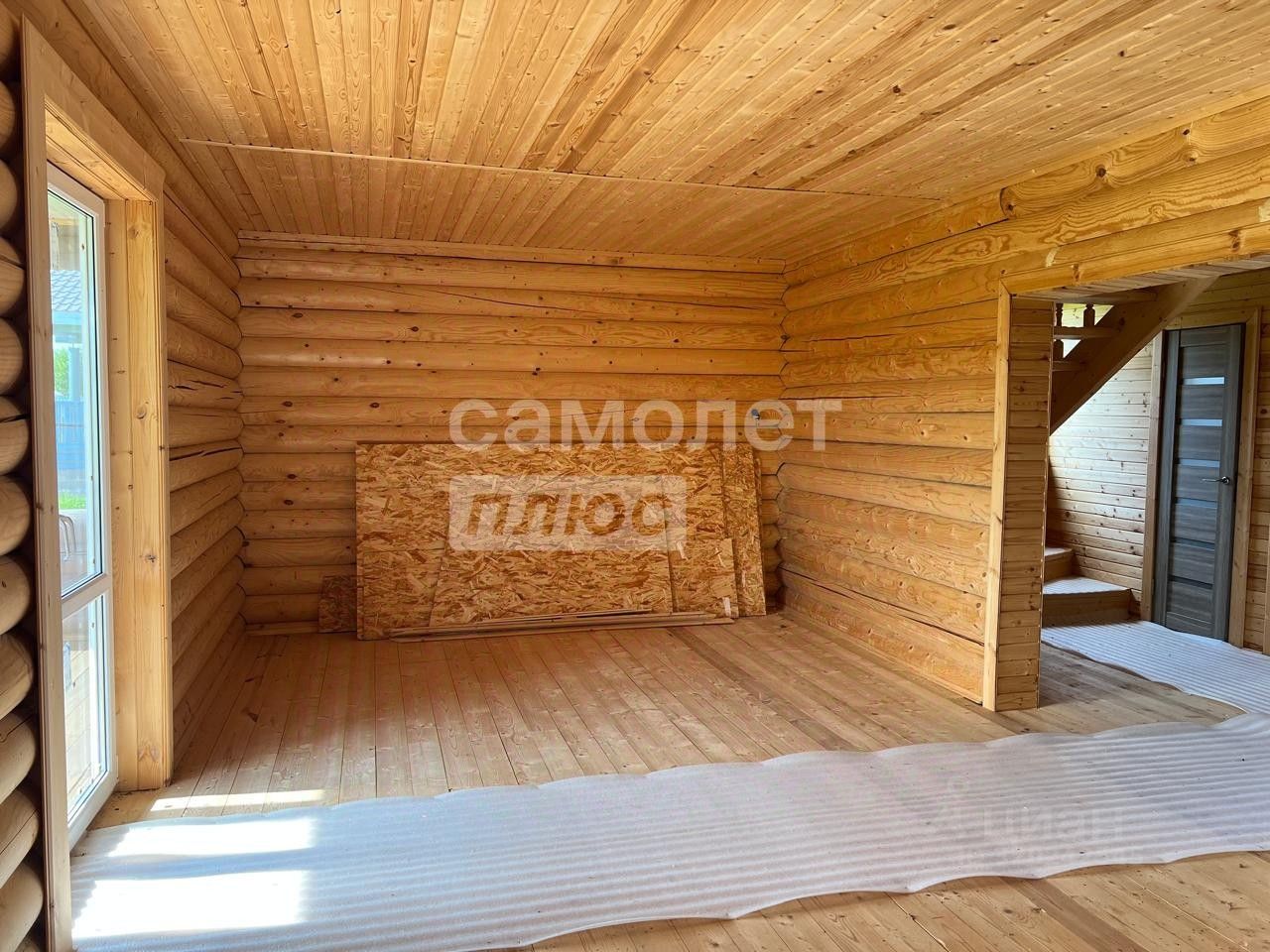 Выполнен из оцилиндрованного бревна 220 мм, на ленточном фундаменте, плюс фундаментные блоки.
