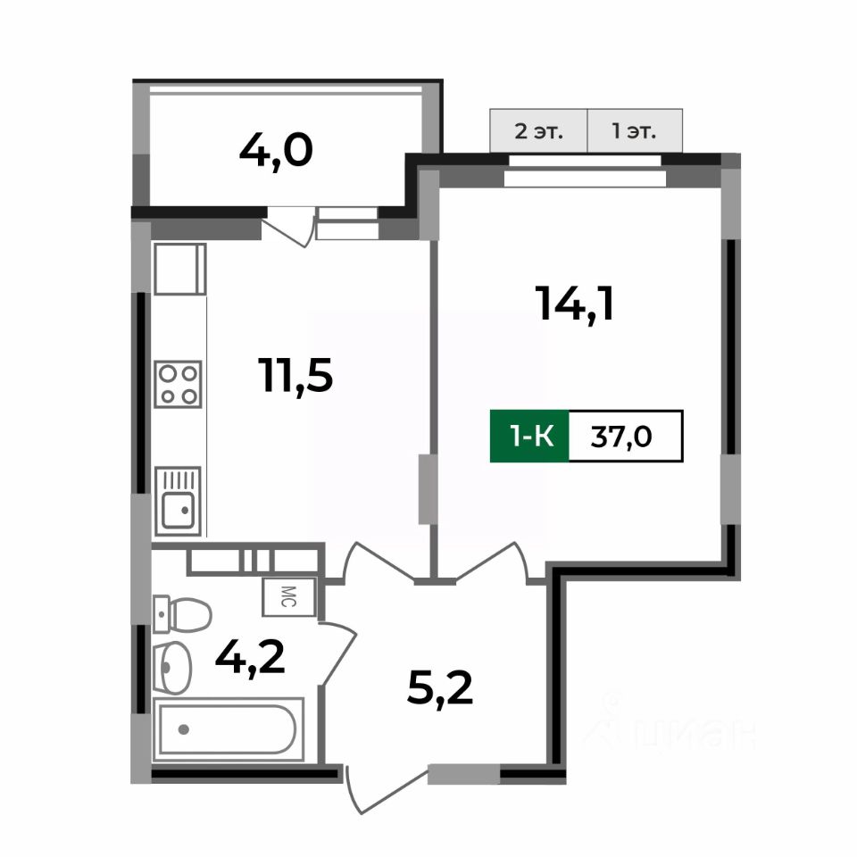 Общая площадь37 м2