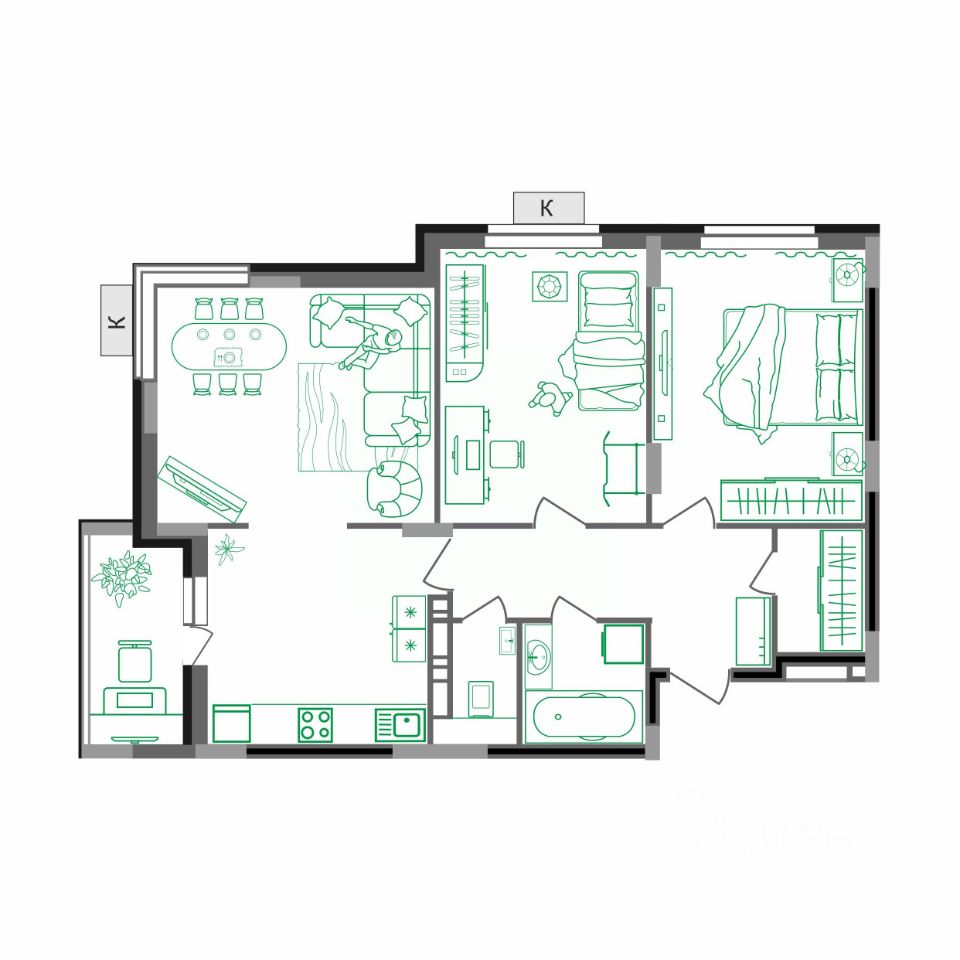 — кухня-гостиная с угловым остеклением и с выходом на лоджию 4,8 кв.м