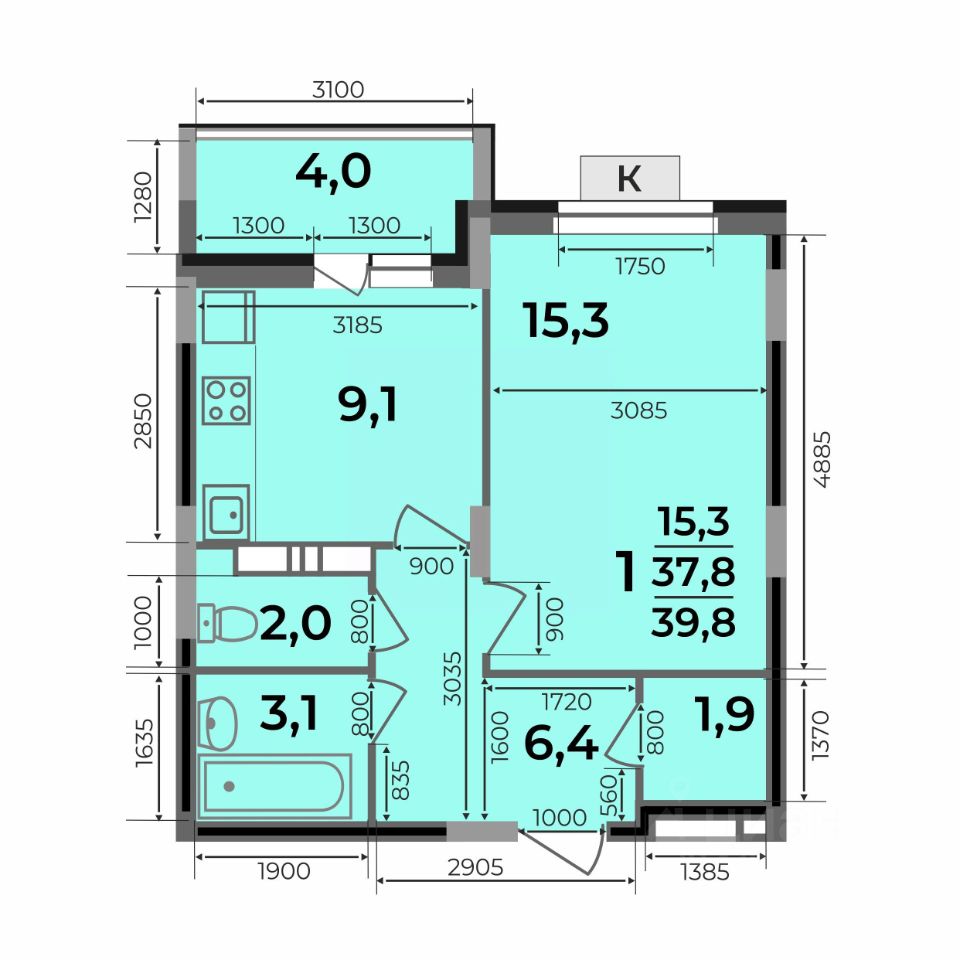 Общая площадь39,8 м2