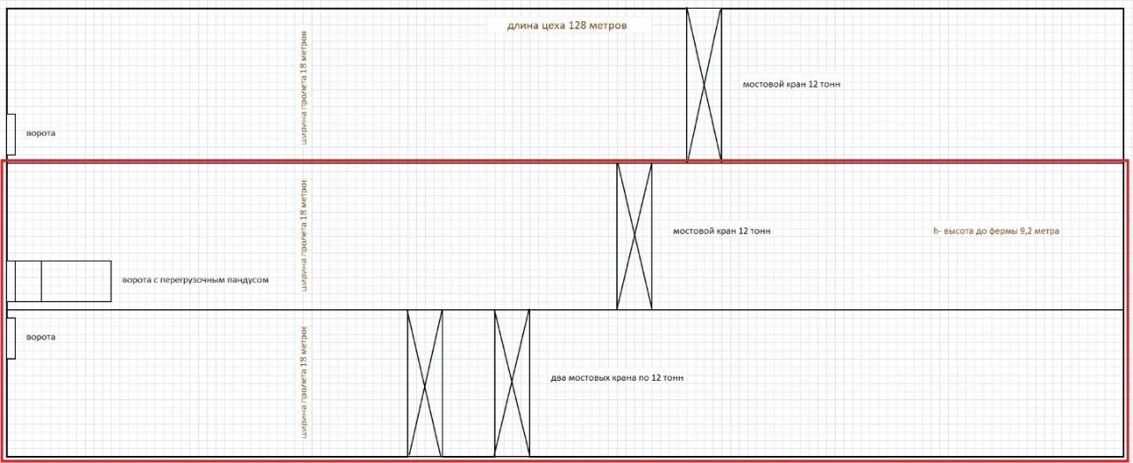 Сдается в аренду производственный цех с мостовыми кранами 12 тонн. ЗДАНИЕ: - два пролета (длина 128 м., ширина обоих 32 м., высота 9,2 м до фермы), - бетонный пол, - двое ворот и одна перегрузочная платформа с пандусом внутри контура цеха, - два мостовых крана грузоподъемностью 12 тонн и одна кран-балка (5 тонн), - подсобные помещения. КОММУНИКАЦИИ: - электричество мощностью 300 кВт, своя ТП, мощность можно увеличить, - водоснабжение и канализация центральные, - газоснабжение подведено, отопления нет, но можно предусмотреть. РАСПОЛОЖЕНИЕ И ЛОГИСТИКА: - центральная часть города Владимира (население 330 тыс. чел.