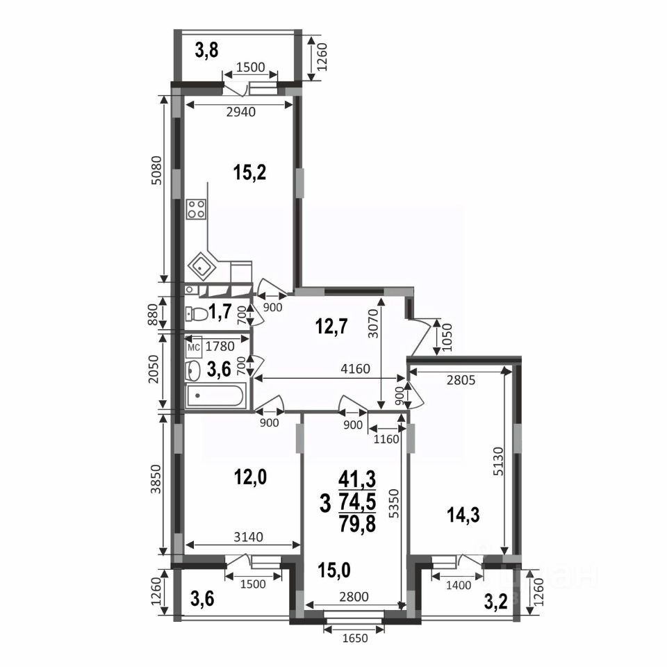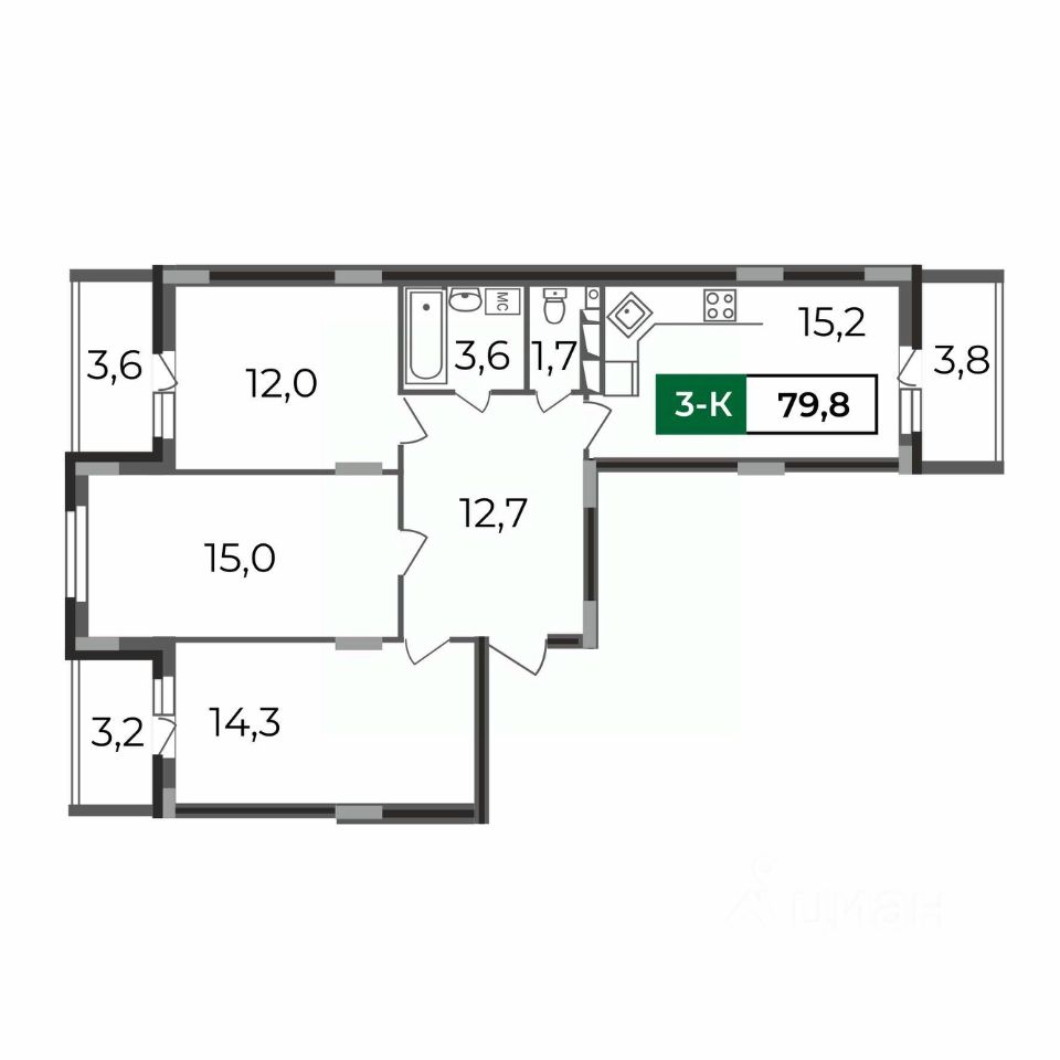 Просторная трешка 79,8 кв.м в строящемся доме ЖК Сталинградский бульвар 7 в новом смарт-квартале VERIZINO life. Классическая планировка-распашонка с тремя обособленными комнатами, просторной кухней 15 кв.м и тремя лоджиями.
