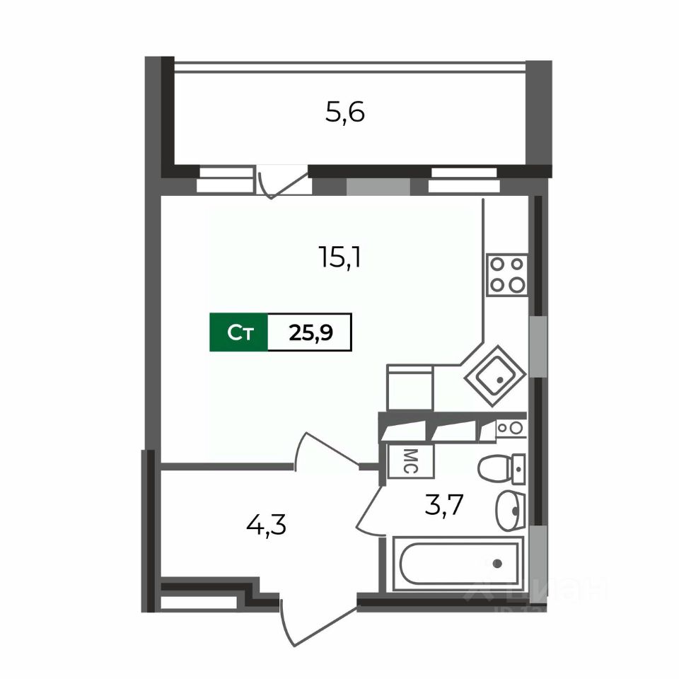 Квартира-студия 25,9 кв.м во 2 подъезде ЖК ''Сталинградский бульвар 5''.