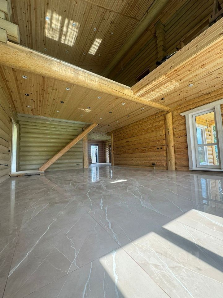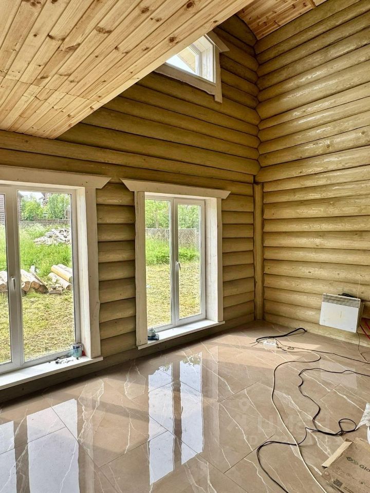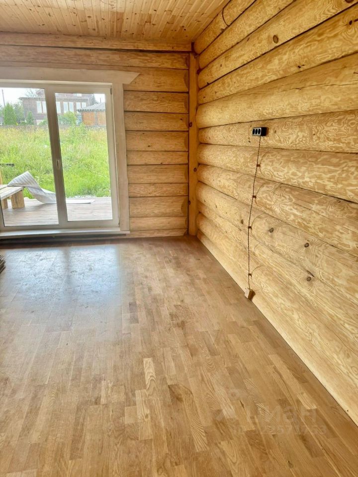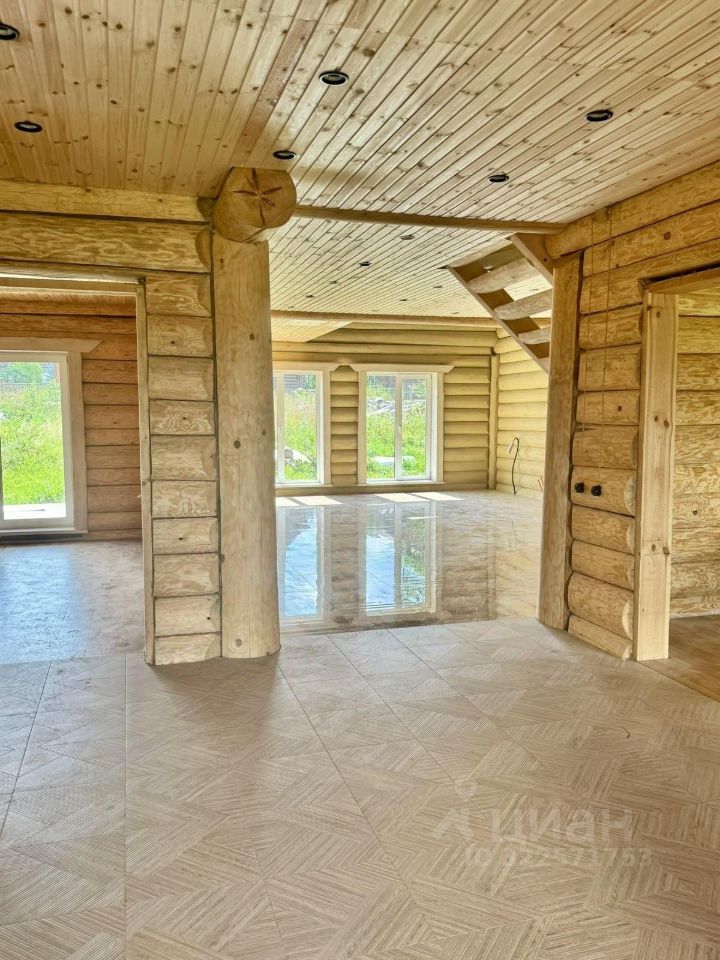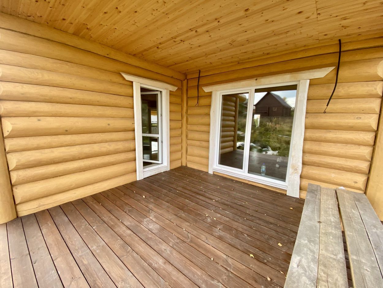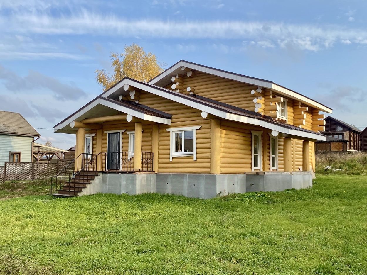 Дом двухэтажный общей площадью 186,9 кв.м. Построен из оцилиндрованного бревна. Дом стоит на бетонном фундаменте. Во всем в доме установлены современные окна ПВХ. При входе в доме сделан коридор-тамбур. Просторная кухня гостиная 66 кв.м. Первый этаж - теплый пол по всей площади дома, второй этаж - радиаторы. На первом этаже еще две комнаты, на втором этаже - две комнаты, Техническая комната (котельная-бойлерная) и совмещенный санузел с душевой кабиной. Из гостиной есть выход на открытую большую терассу и из каждой комнаты своя терасса.. На второй этаж ведет удобная лестница и так же сделан верхний свет, две комнаты и санузел. Дом очень теплый и экологичный.