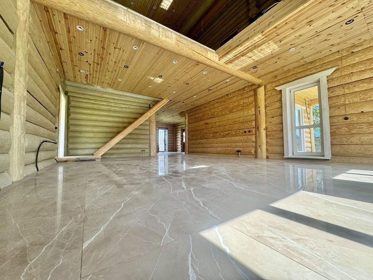 Дом двухэтажный общей площадью 186,9 кв.м. Построен из оцилиндрованного бревна. Дом стоит на бетонном фундаменте. Во всем в доме установлены современные окна ПВХ. При входе в доме сделан коридор-тамбур. Просторная кухня гостиная 66 кв.м. Первый этаж - теплый пол по всей площади дома, второй этаж - радиаторы.
