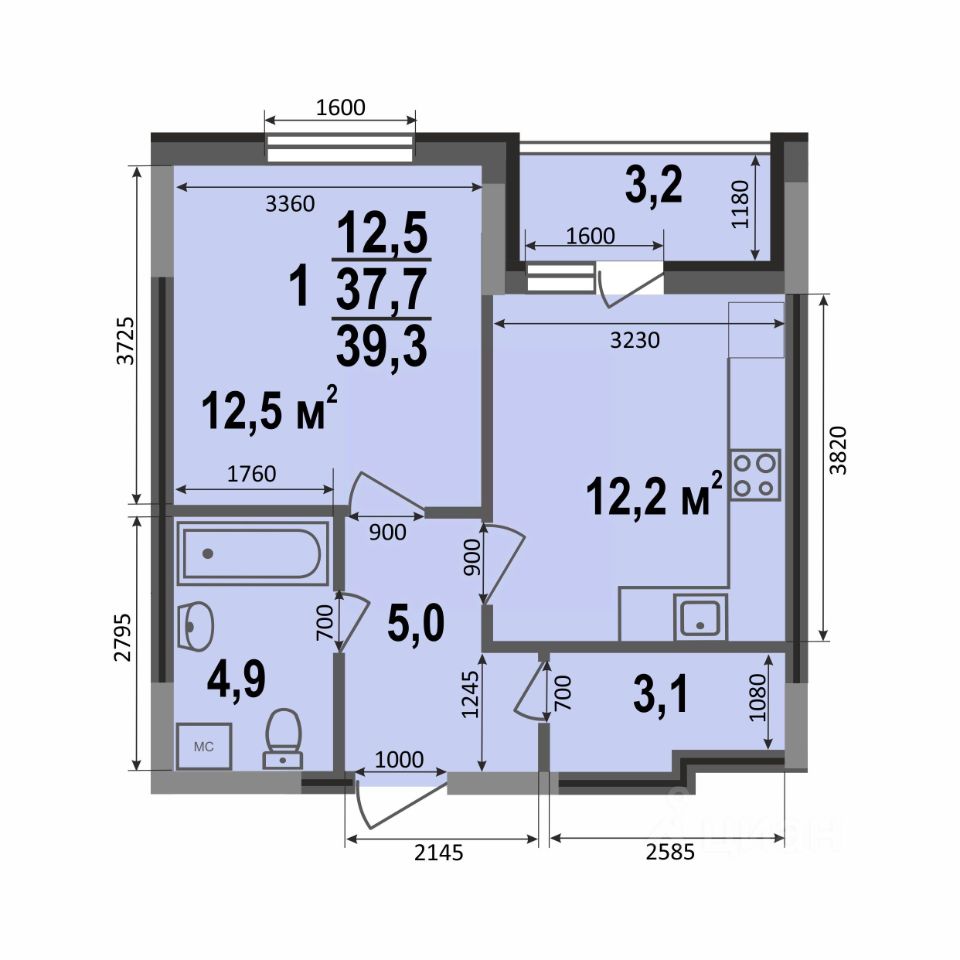 Общая площадь39,3 м2