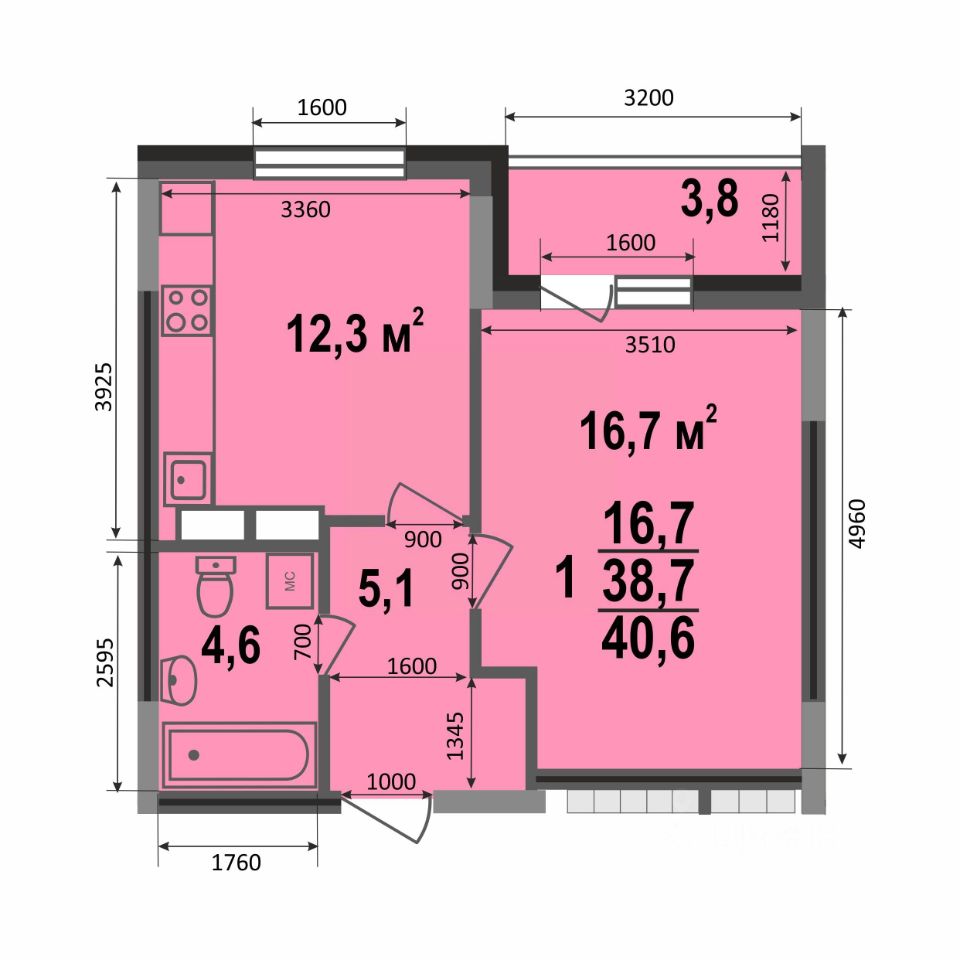 Однокомнатная квартира (40,6/41 кв.м) в 4 подъезде ЖК Смоленская 3А. Окна квартиры выходят на восток в сторону двора. В квартире большая жилая комната 16,7 кв.м с выходом на лоджию, совмещенный санузел, функциональная прихожая и кухня площадью более 12 кв.