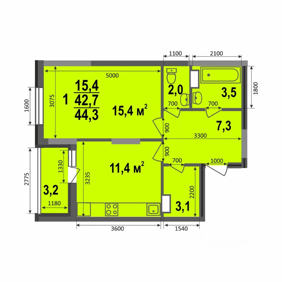 Общая площадь44,3 м2