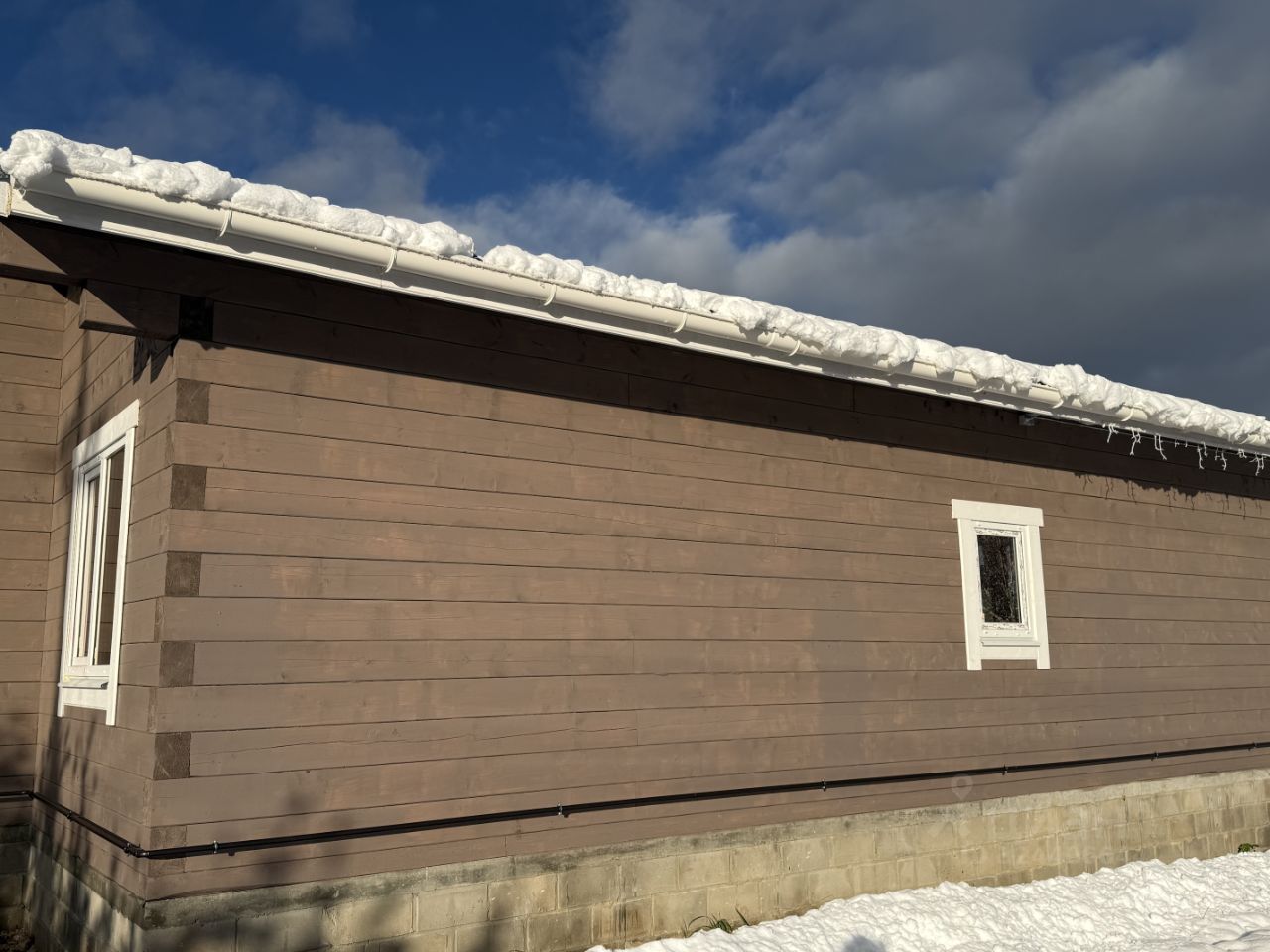 Дом построен из бруса 200х150, фундамент - монолитная плита. Покрытие кровли - металлочерепица. Панорамное остекление. Теплый пол по всей площади дома.