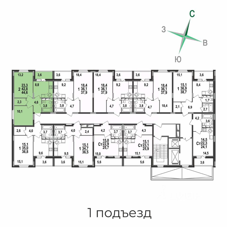 Коридор с выделенной гардеробной, совмещенный санузел, кухня с выходом на лоджию, жилые зоны 10,1/13,2 кв.м