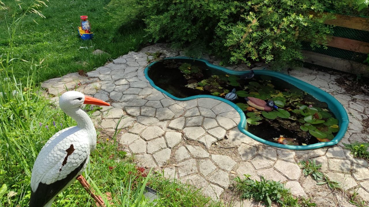 Также на участке расположена бытовка и контейнер, для хранения инвентаря. Имеется прудик с лилиями и молодой плодоносящий сад.