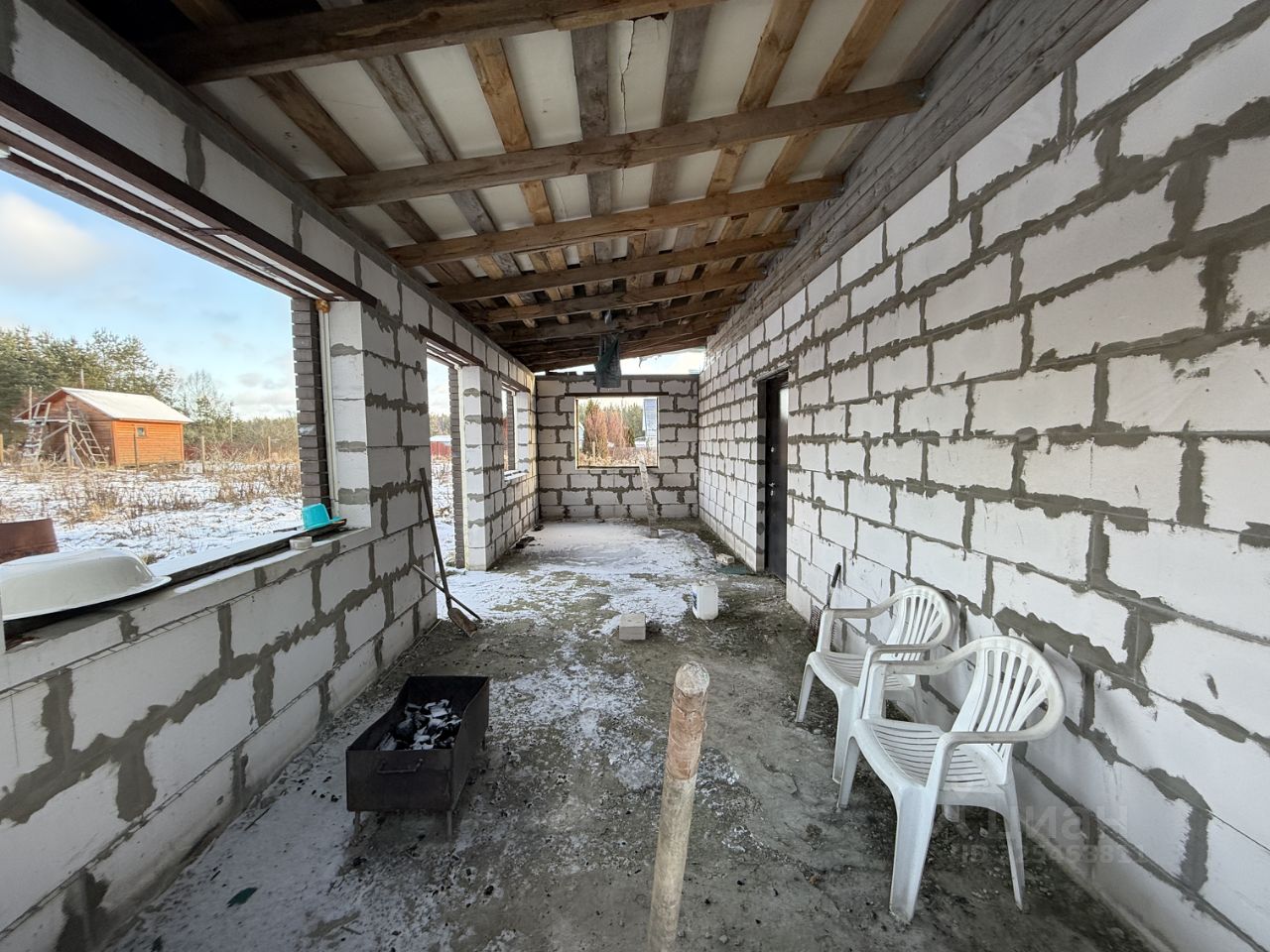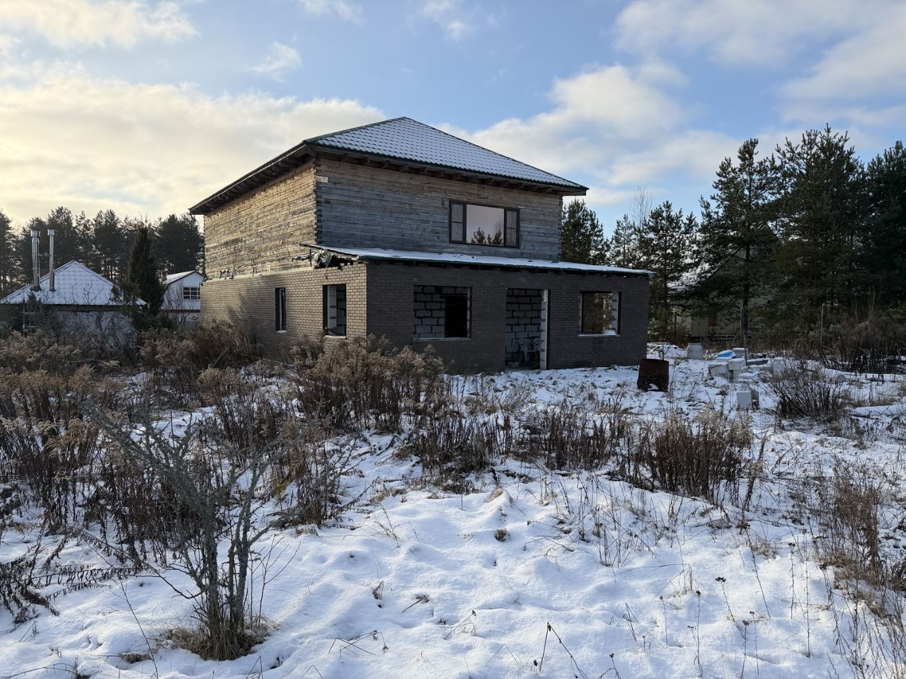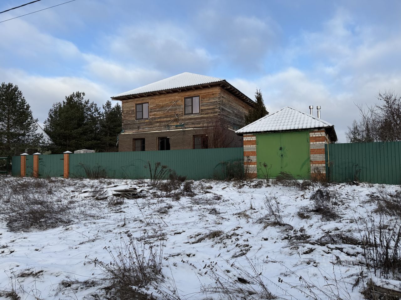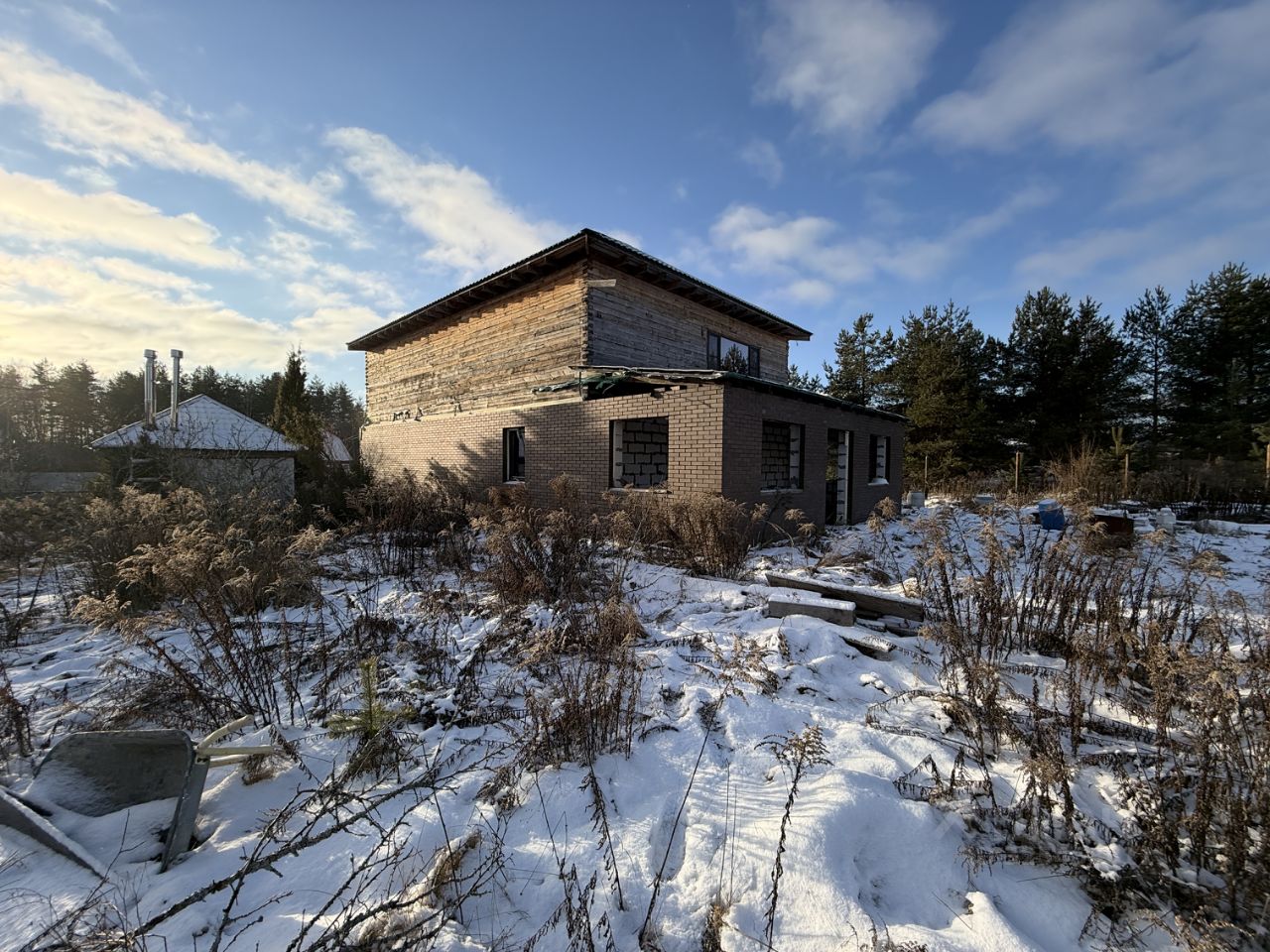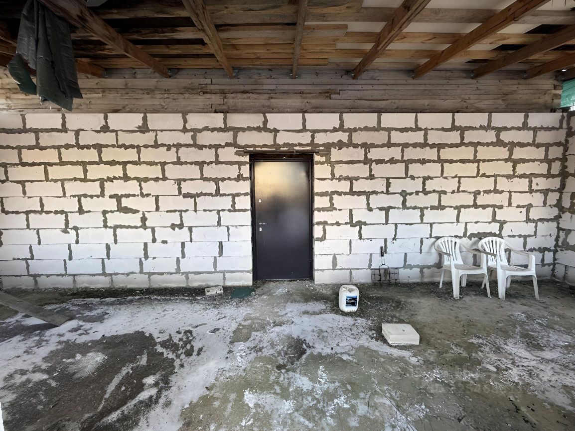 ЖИЛОЙ ДОМ: Дом двухэтажный (1-й этаж - блочный, 2-й этаж - бревенчатый), на отличном ленточном фундаменте, утеплен, площадью 225 кв.м.+ терраса. Дом с частичной отделкой. Снаружи дом почти полностью отделан декоративным кирпичом. На первом этаже - терраса блочная без окон (надо вставлять), коридор - 23 кв.м., кухня - 21.6 кв.м., зал - 33.8 кв.м. и две комнаты 16.8 кв.м. +13.6 кв.м. На втором этаже (площадь второго этажа 116,1 кв.м.) - холл, помещение для сан.узла и три раздельные комнаты. Высота потолков 2.38 метров.