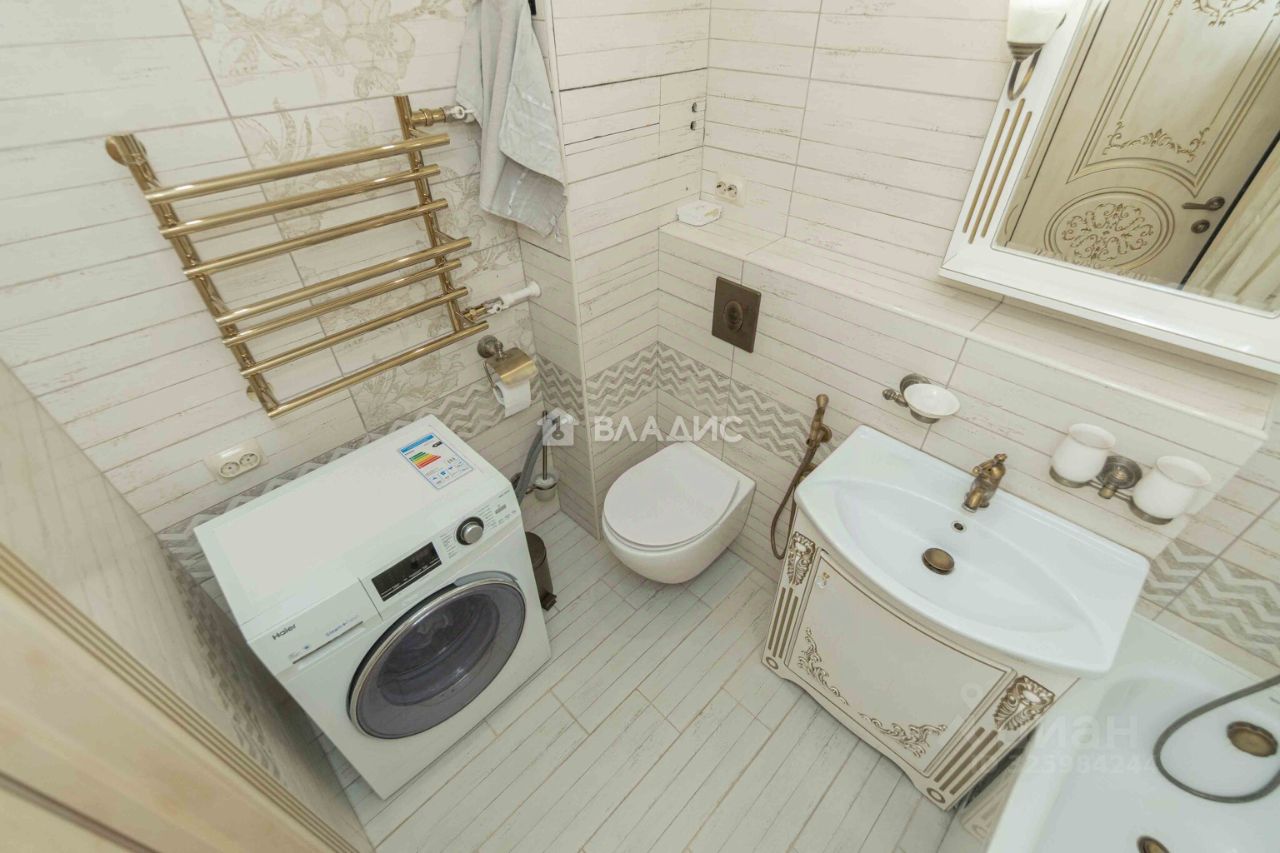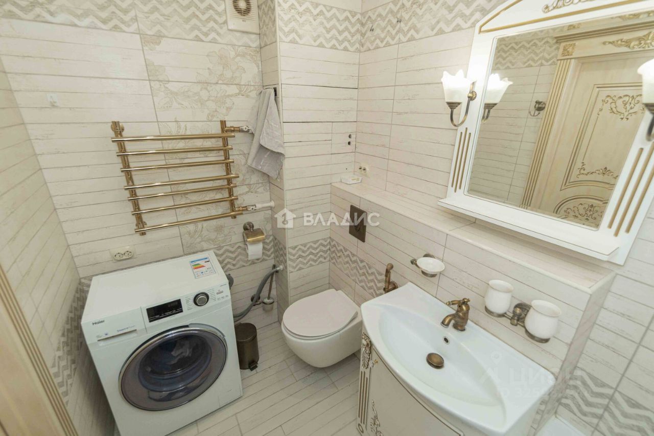 Комната 18,8 м² вмещает в себя: диван, кресло и большой шкаф-купе вдоль стены. В комнате установлен кондиционер. Санузел 4 м²: теплые полы, инсталляция, гигиенический душ, стиральная машина Haier. Вместительный шкаф-купе в прихожей.