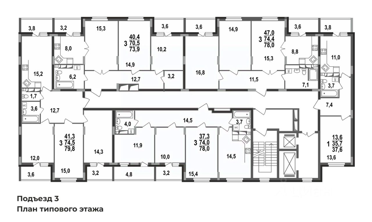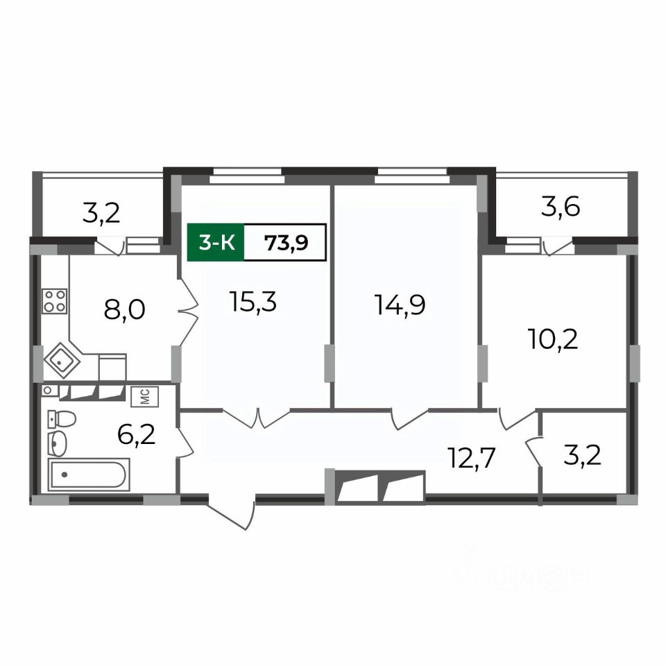 Просторная трехкомнатная квартира 73,9 кв.м в строящемся доме ЖК Сталинградский бульвар 7 в новом смарт-квартале VERIZINO life. Классическая планировка квартиры с кухней-гостиной, гардеробной и двумя лоджиями.