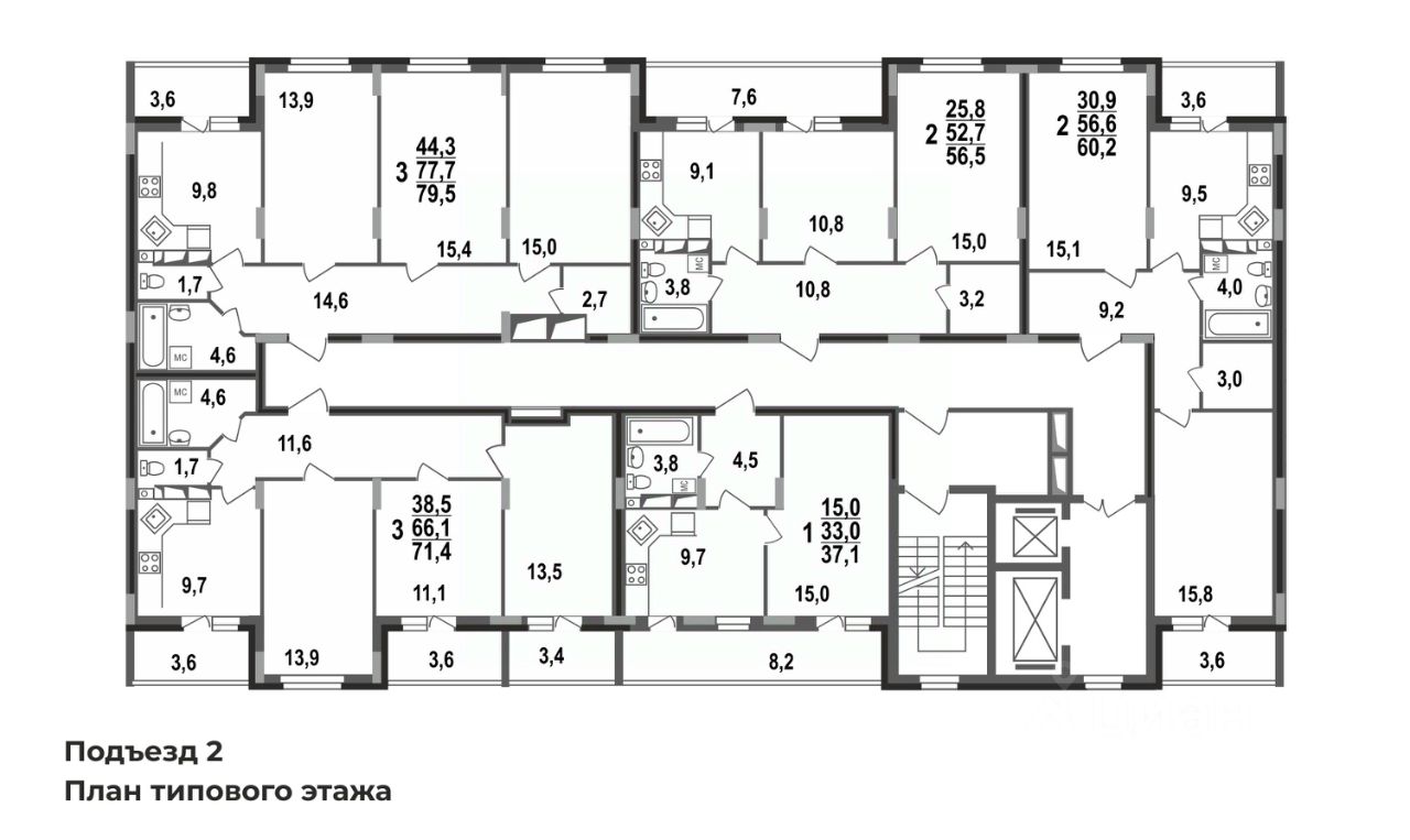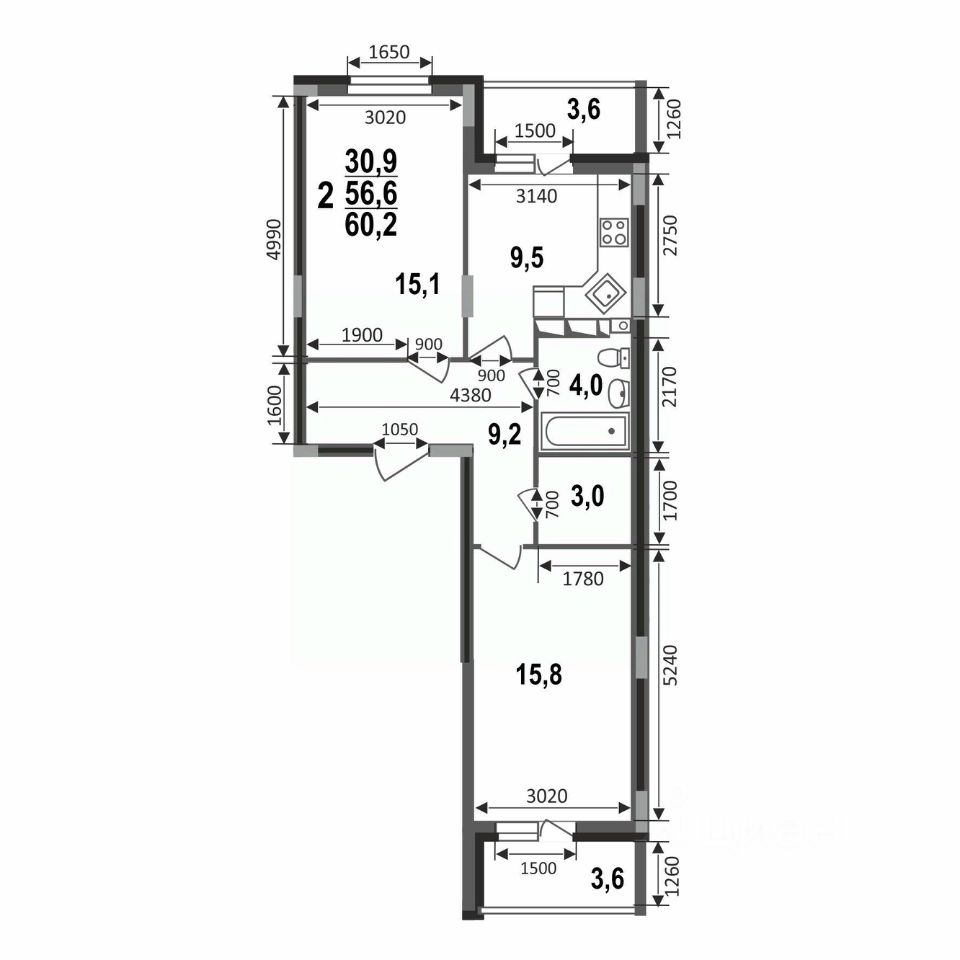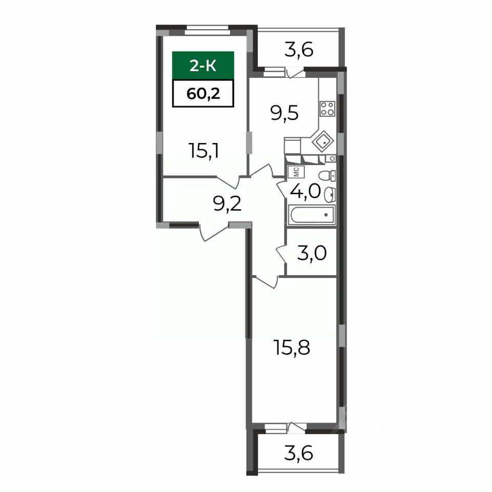 Двухкомнатная квартира-распашонка 60,2 кв.м в монолитном доме от застройщика - ЖК Сталинградский бульвар 7.