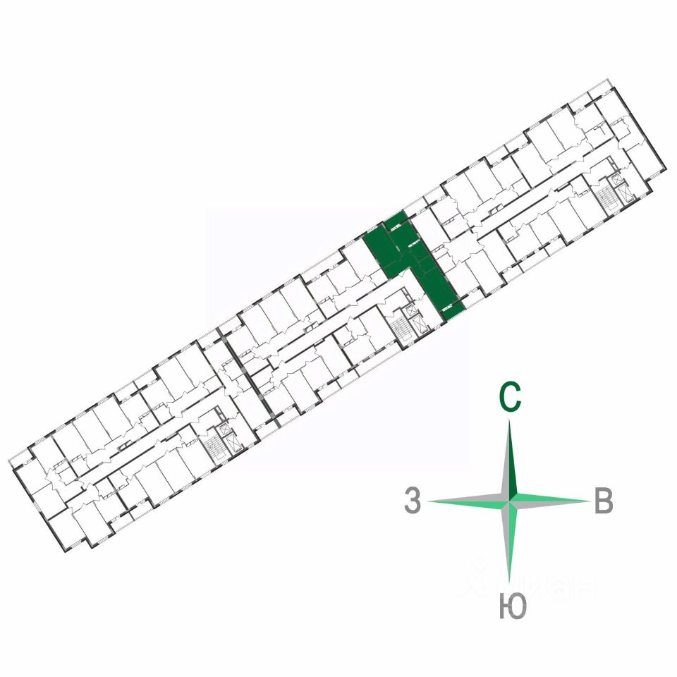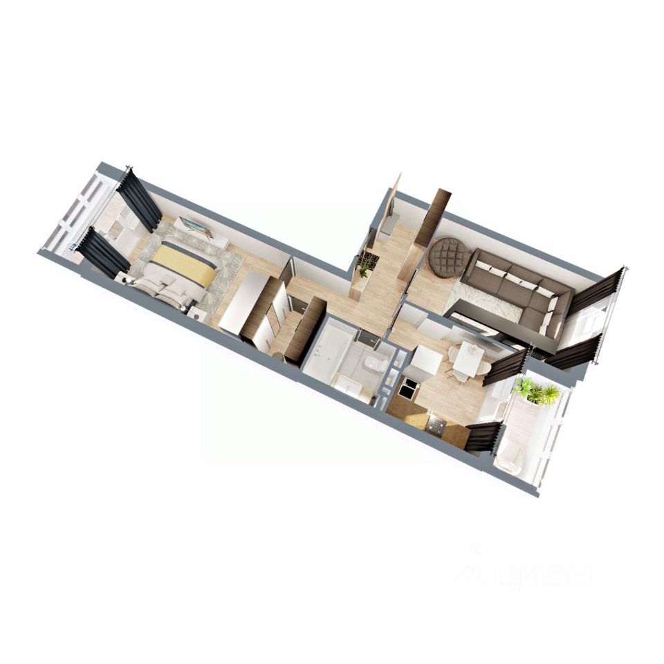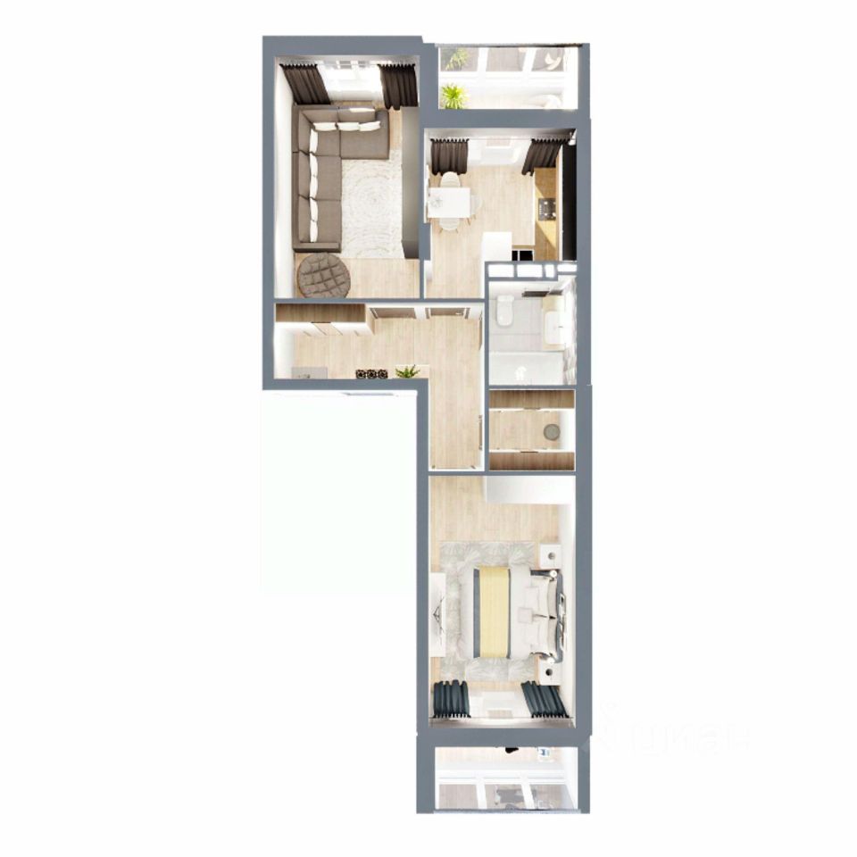 Две раздельные комнаты на с-з и ю-в, кухня 9,5 кв.м и просторный коридор с гардеробной и с выделенным местом под шкаф-купе. Классическая планировка семьи из 3-4 человек.