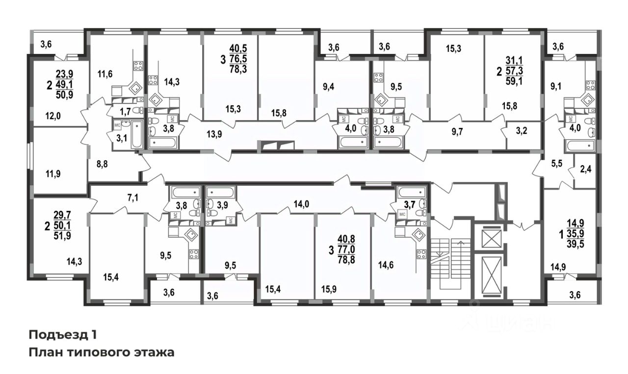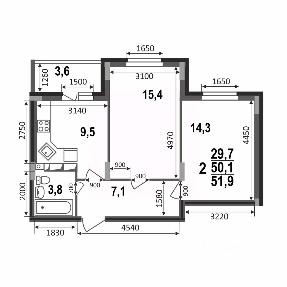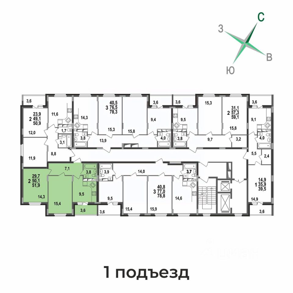 Плюсы: квадратная кухня почти 9,5 кв.м с выходом на лоджию, просторные раздельные жилые комнаты 14/15 кв.м, совмещенный санузел, функциональная прихожая с местом под шкаф-купе