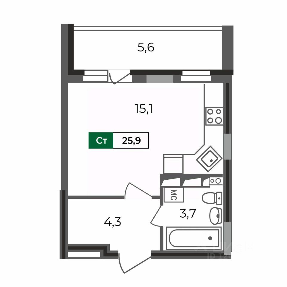 Квартира-студия 25,9 кв.м в 1 подъезде ЖК ''Сталинградский бульвар 5''.
