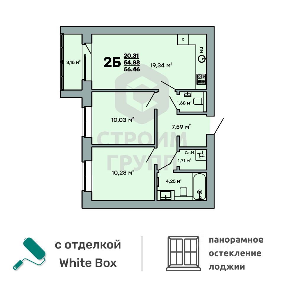 Особенностью этой двухкомнатной квартиры является объединенная с кухней гостиная общей площадью более 19 квадратных метров! Помещение разделено на зоны для приготовления пищи, где можно установить кухонный гарнитур и большой обеденный стол для всей семьи, и ТВ-зону, где поместится хороший просторный диван. Из кухни имеется выход на лоджию (больше 3 кв. м.), которая будет остеклена 2-камерным стеклопакетом при сдаче дома. При такой планировке совмещенной кухни и гостиной, неоспоримым преимуществом этой двухкомнатной квартиры являются две отдельные комнаты. Одну из них, площадью 10,3 квадратных метров, можно использовать под спальную комнату, где можно установить широкую кровать или раскладной диван и вместительный шкаф для одежды. Вторую комнату, площадью 10 квадратных метров, можно использовать в качестве детской или кабинета. Интересным и полезным решением в этой двухкомнатной квартире стали два санузла! Один - полноценный, площадью 4,25 квадратных метра, а второй - небольшой, площадью 1,7 квадратных метра, с отдельным унитазом. Для семьи с детьми - очень актуальное решение. Отдельное внимание стоит обратить на помещение рядом с большим санузлом в нём можно организовать отдельную постирочную комнату или гардеробную. Прихожая (больше 7,5 кв. м.) является непроходной. Изолированность прихожей позволяет держать в чистоте остальные помещения квартиры грязь с улицы не будет разноситься по комнатам. Доступны такие способы покупки, как наличные, ипотека от ведущих банков (в т.ч. все программы с субсидиями и господдержка), ипотека со снижением ставки за счёт застройщика, рассрочка до 2 лет напрямую от застройщика. В цену квартиры сразу входит ремонт в формате White Box с гарантией на все работы!